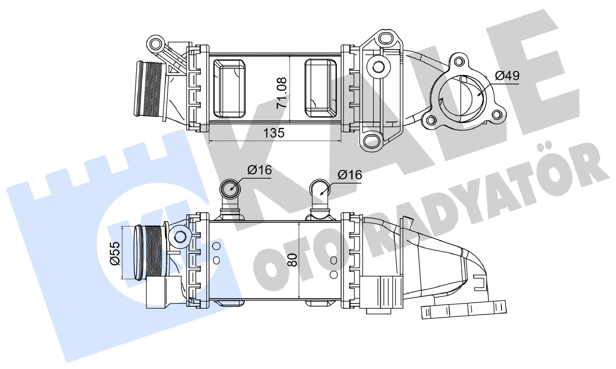 Входящ отвор Ø: 55mmдълбочина на мрежа: 80mmдължина на мрежа: 135mmизпълнение на охладител: запоени охлацдащи ламелиИзходящ отвор Ø: 49mmматериал на ламелите на радиатора: алуминийматериал на резервоар (охладител): пластмасаширина на мрежа: 71mm
