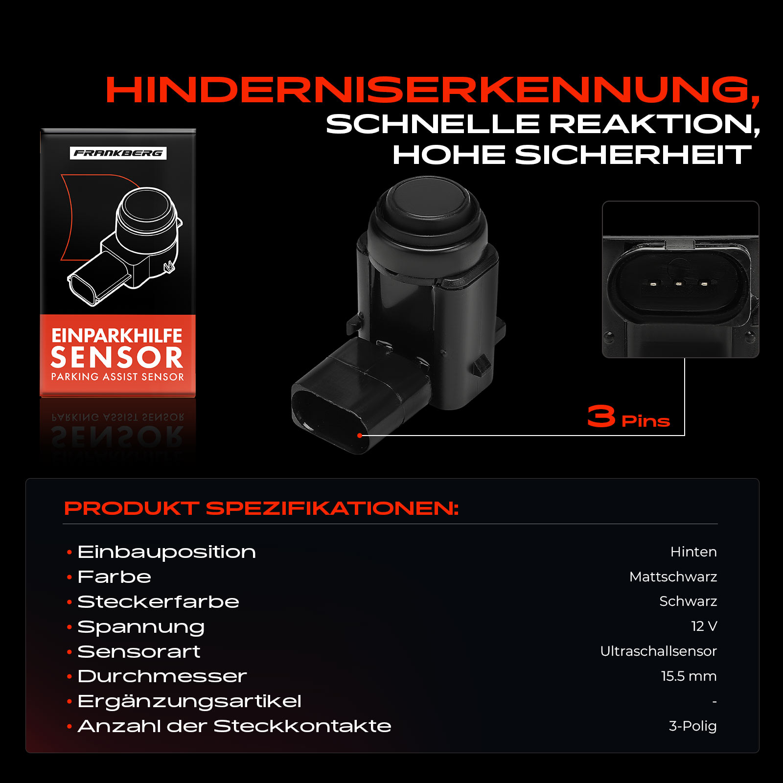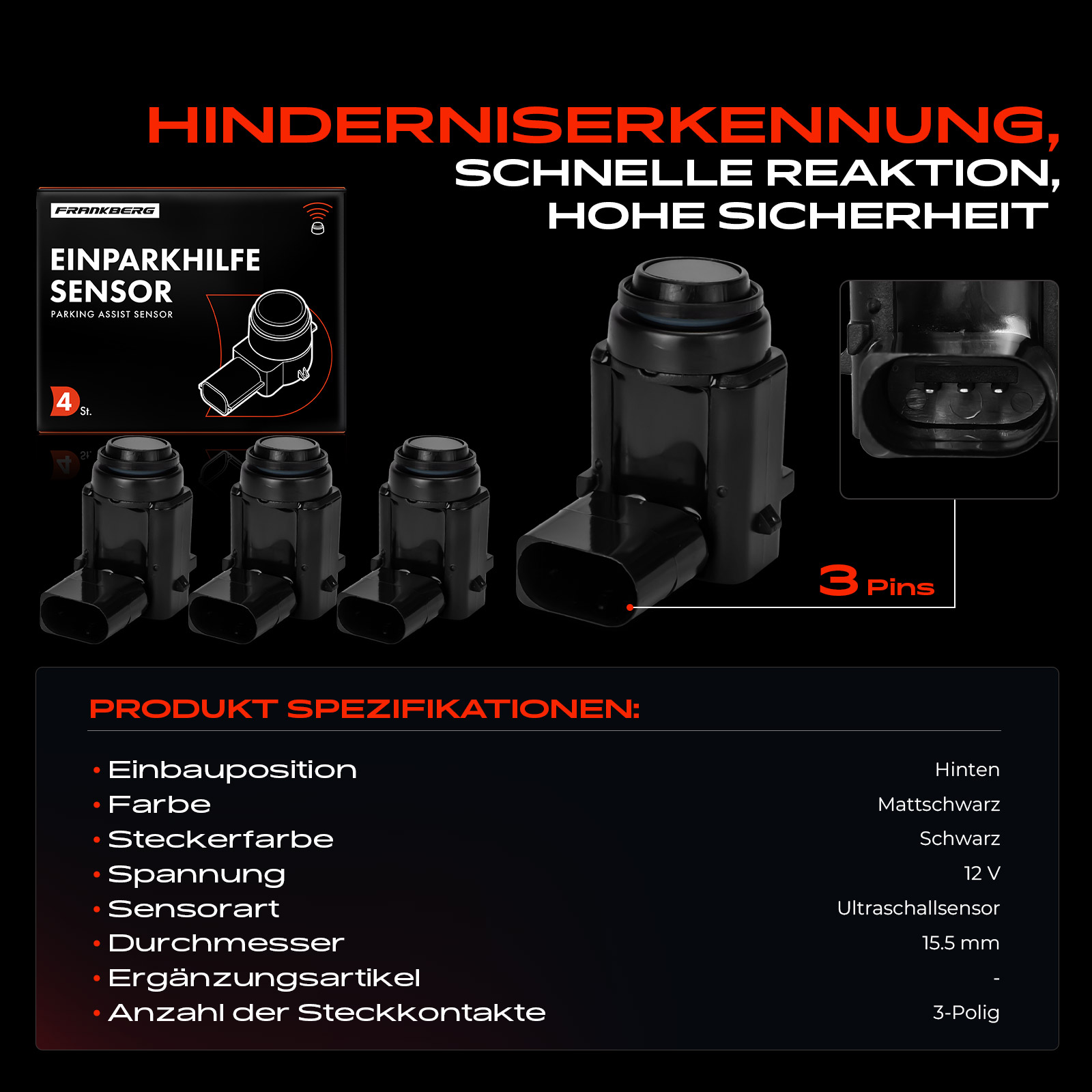 брой на щепселните контакти: 3-щифтенвид на датчика: свръхзвуков датчикØ: 15,5mmнапрежение: 12волтколичество: 4страна на монтаж: отзадцвят: черенцвят на щекер: черен