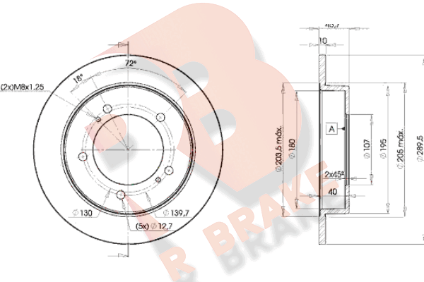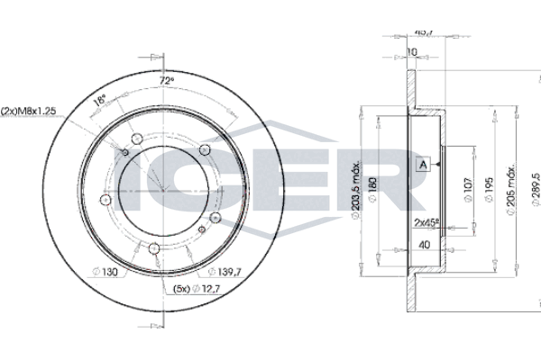 брой на дупките: 5вид на спирачния диск: вентилиранвисочина: 46,1mmвъншен диаметър: 290mmдебелина на спирачния диск: 10mmОтвор Ø до: 12,75mmДиаметър на кръговата стъпка Ø: 139,7mmмин. дебелина: 8mmповърхност: с покритиестрана на монтаж: предна осцентриращ диаметър: 107mm