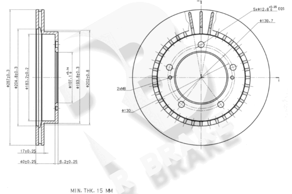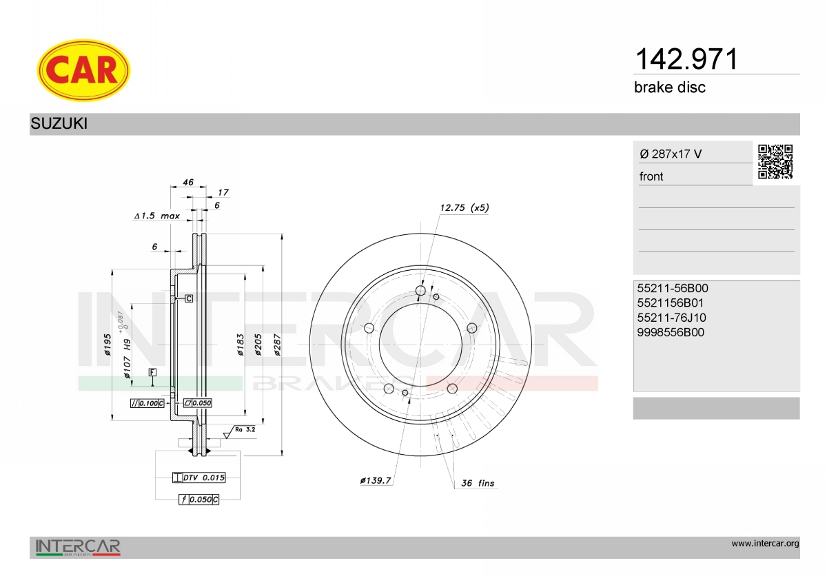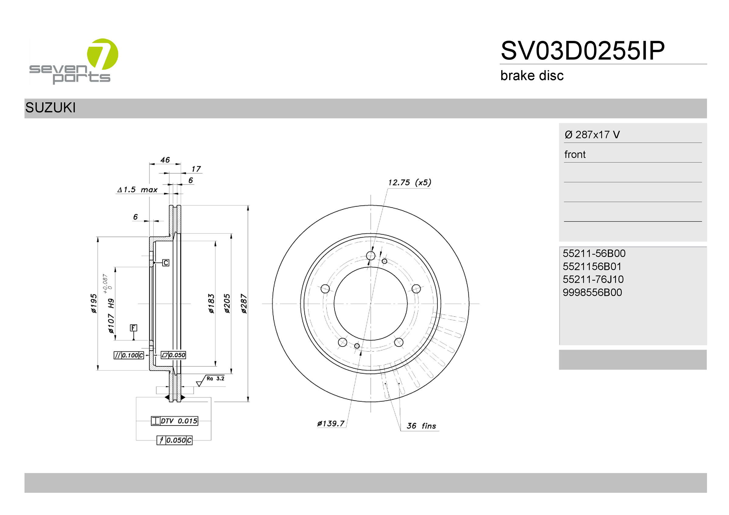 страна на монтаж: предна осджанта: 5-дупкивид на спирачния диск: вентилиранвисочина: 46mmвъншен диаметър: 287mmдебелина на спирачния диск: 17mmГлавина Ø: 195mmДиаметър на кръговата стъпка Ø: 139,7mmмин. дебелина: 15mmцентриращ диаметър: 107mm