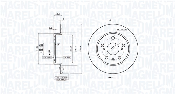 страна на монтаж: задна осброй на дупките за закрепване: 5вид на спирачния диск: плътенвисочина: 43mmвъншен диаметър: 259mmдебелина на спирачния диск: 9mmОтвор Ø: 14,2mmконструкция на спирачките: дискови спирачкиДиаметър на кръговата стъпка Ø: 114,3mmмин. дебелина: 8mmтегло: 3,8kgцентриращ диаметър: 62mm