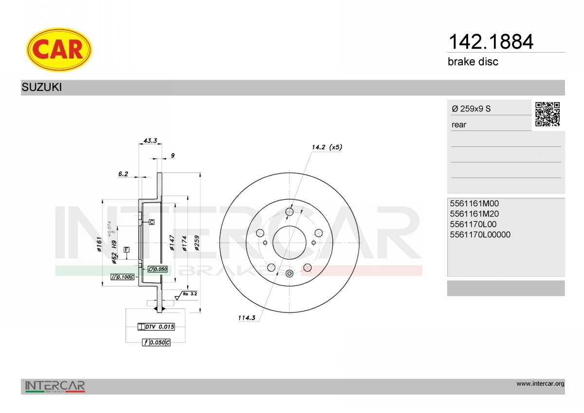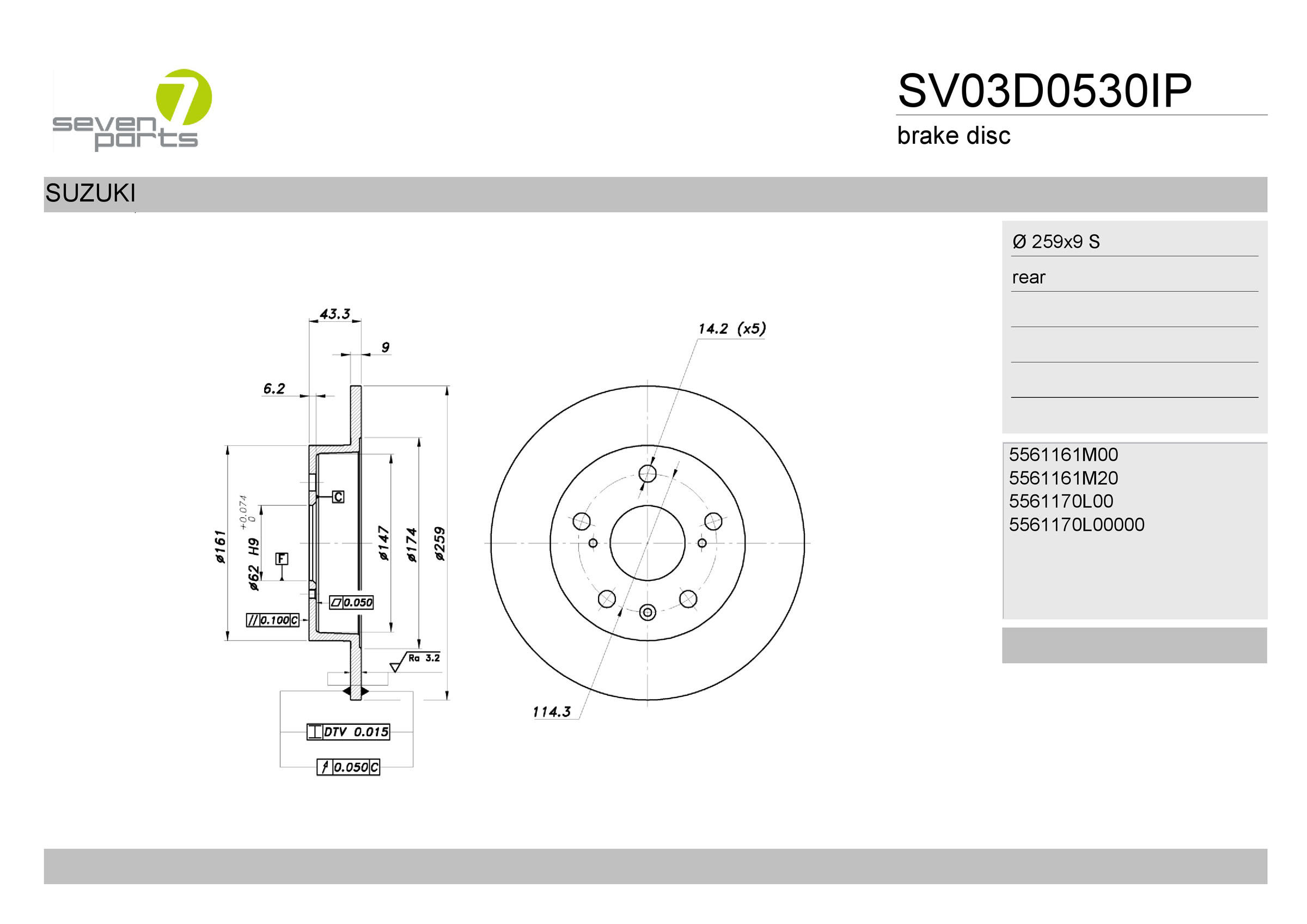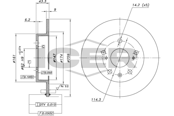 брой на дупките: 5брой на дупките 1: 1вид на спирачния диск: плътенвисочина: 43,2mmвъншен диаметър: 259mmвътрешен диаметър: 147mmдебелина на спирачния диск: 9mmДиаметър на кръговата стъпка Ø: 114,3mmмин. дебелина: 8mmмярка на резбата: 14,2разстояние между дупките 1: 114,3mmстрана на монтаж: задна остегло: 3,5kgцентриращ диаметър: 62mm