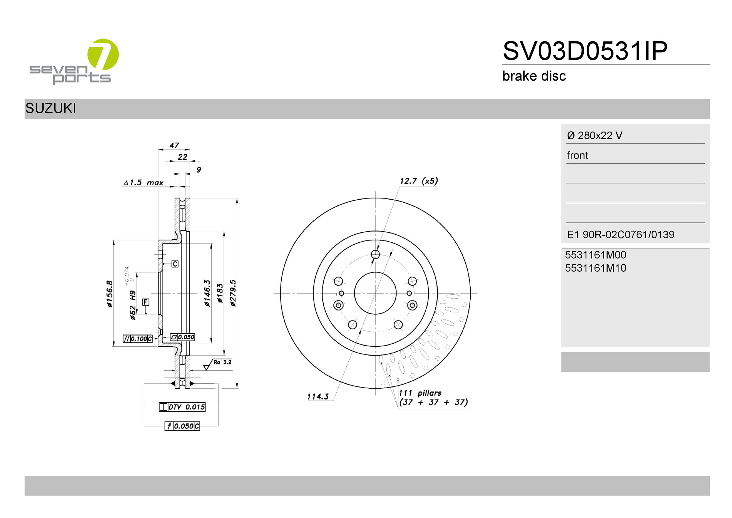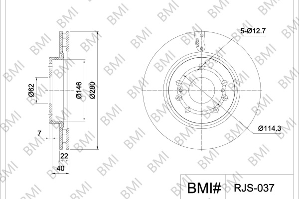 брой на дупките: 5вид на спирачния диск: вентилиранвисочина: 47mmвъншен диаметър: 280mmдебелина на спирачния диск: 22mmОтвор Ø до: 12,7mmДиаметър на кръговата стъпка Ø: 114,3mmмин. дебелина: 20mmповърхност: с покритиестрана на монтаж: предна осцентриращ диаметър: 62mm