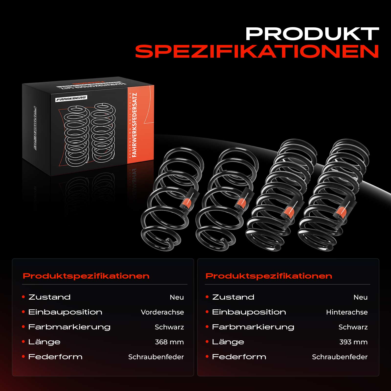 Ø: 80mmдиаметър на жичките: 16mmдължина: 368mmстрана на монтаж: предна осформа на пружина: спирална пружинаходова част: за автомобили със стандартно окачванецветна маркировка: черен