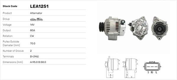 ID-изпълнение на щекера: S / IG / Lнапрежение: 14волтзаряден ток на генератор: 70Аизпълнение на електрическата мрежа: за автомобили с 12V електросистемаклема: B+ M6ремъчни шайби: за двойна ремъчна шайбаРемъчна шайба Ø: 57mm