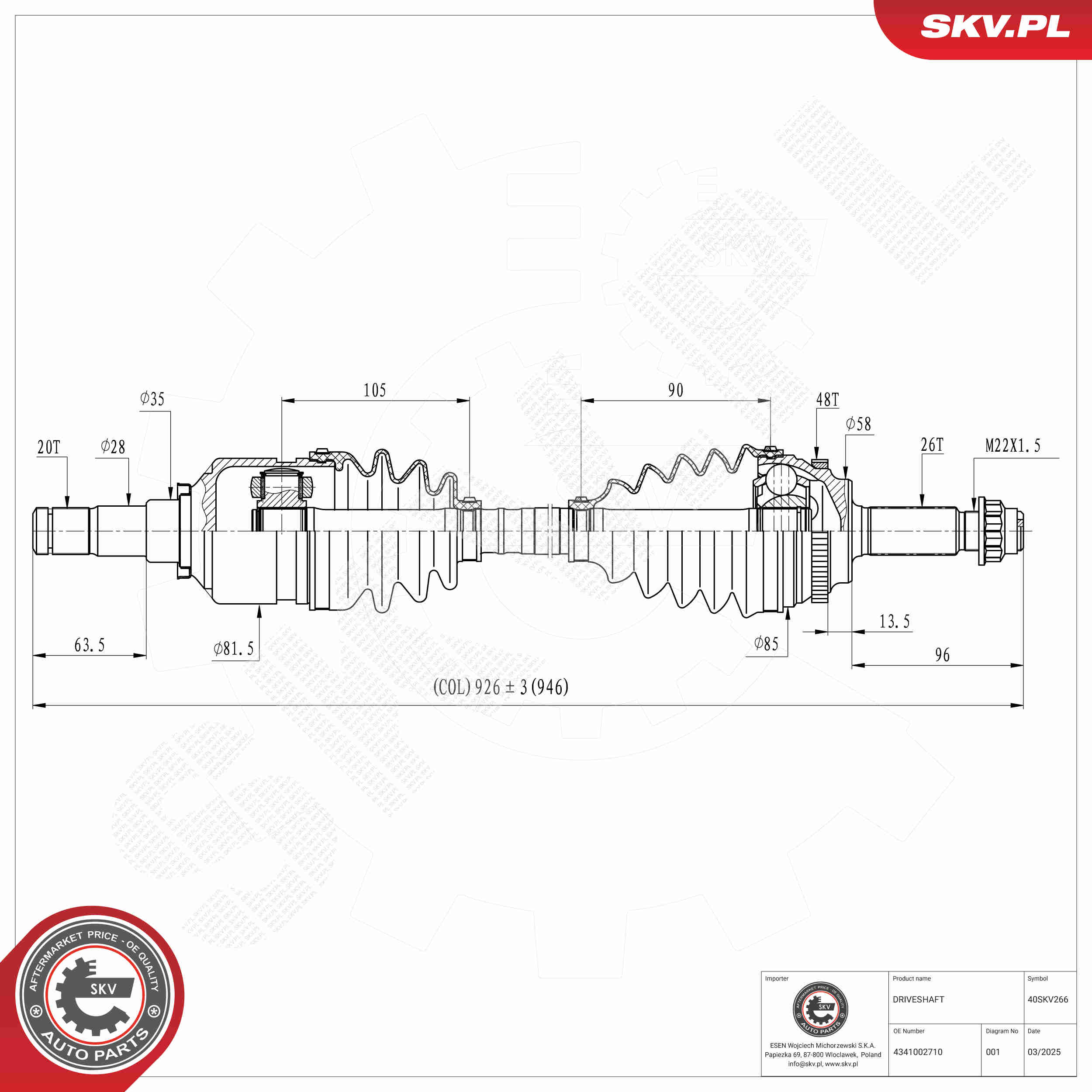 брой на зъбите: 48външни зъби от страна на колелото: 26външни зъби откъм диференциал: 20дължина: 925mmстрана на монтаж: на предната ос отдясно
