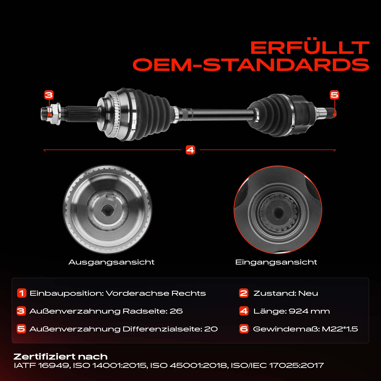 брой на зъбите на ABS-пръстен: 48външни зъби от страна на колелото: 26външни зъби откъм диференциал: 20дължина: 924mmмярка на резбата: M22x1,5страна на монтаж: на предната ос отдяснотип на трансмисията: автоматична трансмисия с възможност за ръзно превключване