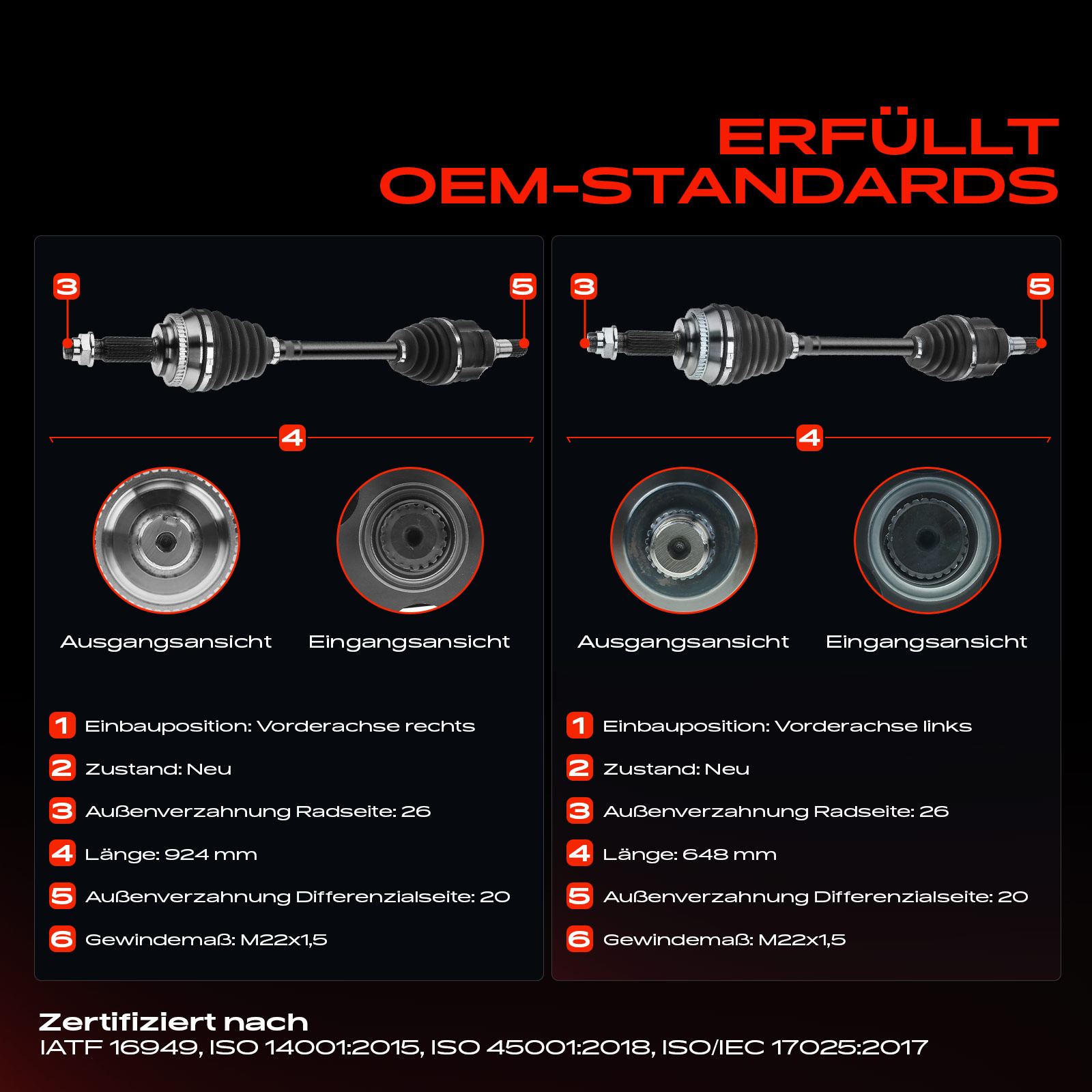 брой на зъбите на ABS-пръстен: 48външни зъби от страна на колелото: 26външни зъби откъм диференциал: 20дължина: 924mmдължина 2: 648mmмярка на резбата: M22x1.5страна на монтаж: от двете страни на предната остип на трансмисията: автоматична трансмисия с възможност за ръзно превключване