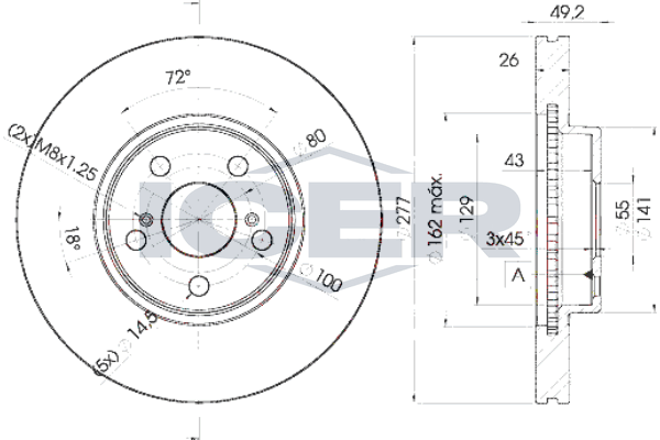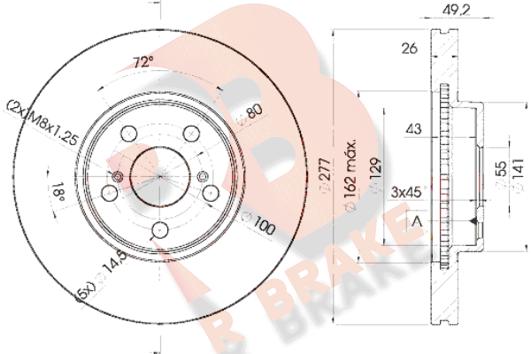 спирачна/динамика на движение: 1страна на монтаж: предна осджанта: 5-дупкивид на спирачния диск: вентилиранвисочина: 49,4mmвъншен диаметър: 277mmдебелина на спирачния диск: 26mmГлавина Ø: 141mmДиаметър на кръговата стъпка Ø: 100mmмин. дебелина: 24mmповърхност: с покритиецентриращ диаметър: 55mm