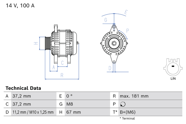 брой на дупките за закрепване: 3брой на каналите: 6напрежение: 12волтзаряден ток на генератор: 100Акачество: +Lineклема: B+ (M6)ремъчни шайби: с ремъчна шайба със свободен ходРемъчна шайба Ø: 67mm