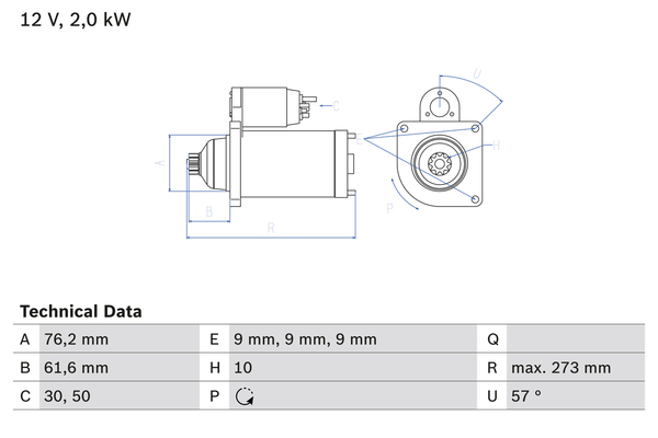 брой на дупките за закрепване: 3брой на зъбите: 10вид стартер: свободно изхвърляемОтвор Ø: 9mmОтвор Ø 2: 9mmФланец Ø: 76,2mmдължина: 273mmнапрежение: 12волтклема: 30клема: 50стартова мощност: 2киловатводещо зъбно колело - основна позиция: 61,6mmОтвор Ø 3: 9mmположение/градус: rechts°посока на въртене: въртене по посока срещу часовниковата стрелкастойка за закрепване: 57°ъгъл на носач крепежно отверстие: 57°