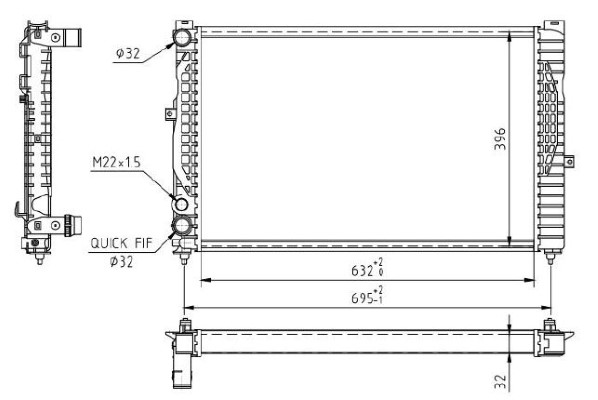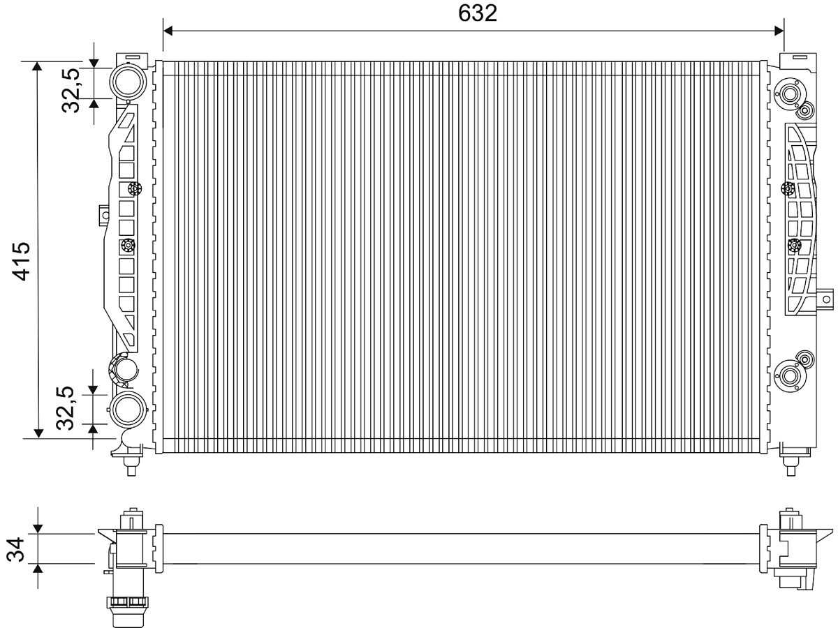 Входящ отвор Ø: 32mmИзходящ отвор Ø: 32,5mmдълбочина на мрежа: 34mmдължина на мрежа: 632mmизпълнение на охладител: механично съединени охлаждащи ламелиматериал на ламелите на радиатора: алуминийматериал на резервоар (охладител): пластмасаширина на мрежа: 415mm