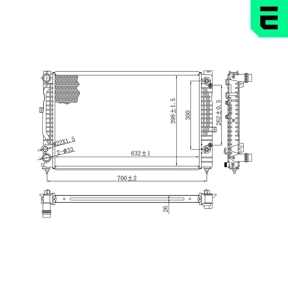 Входящ отвор Ø: 33mmИзходящ отвор Ø: 33mmдълбочина на мрежа: 32mmдължина на мрежа: 632mmизпълнение на охладител: запоени охлацдащи ламелитип на трансмисията: ръчна скоростна кутияширина на мрежа: 398mm