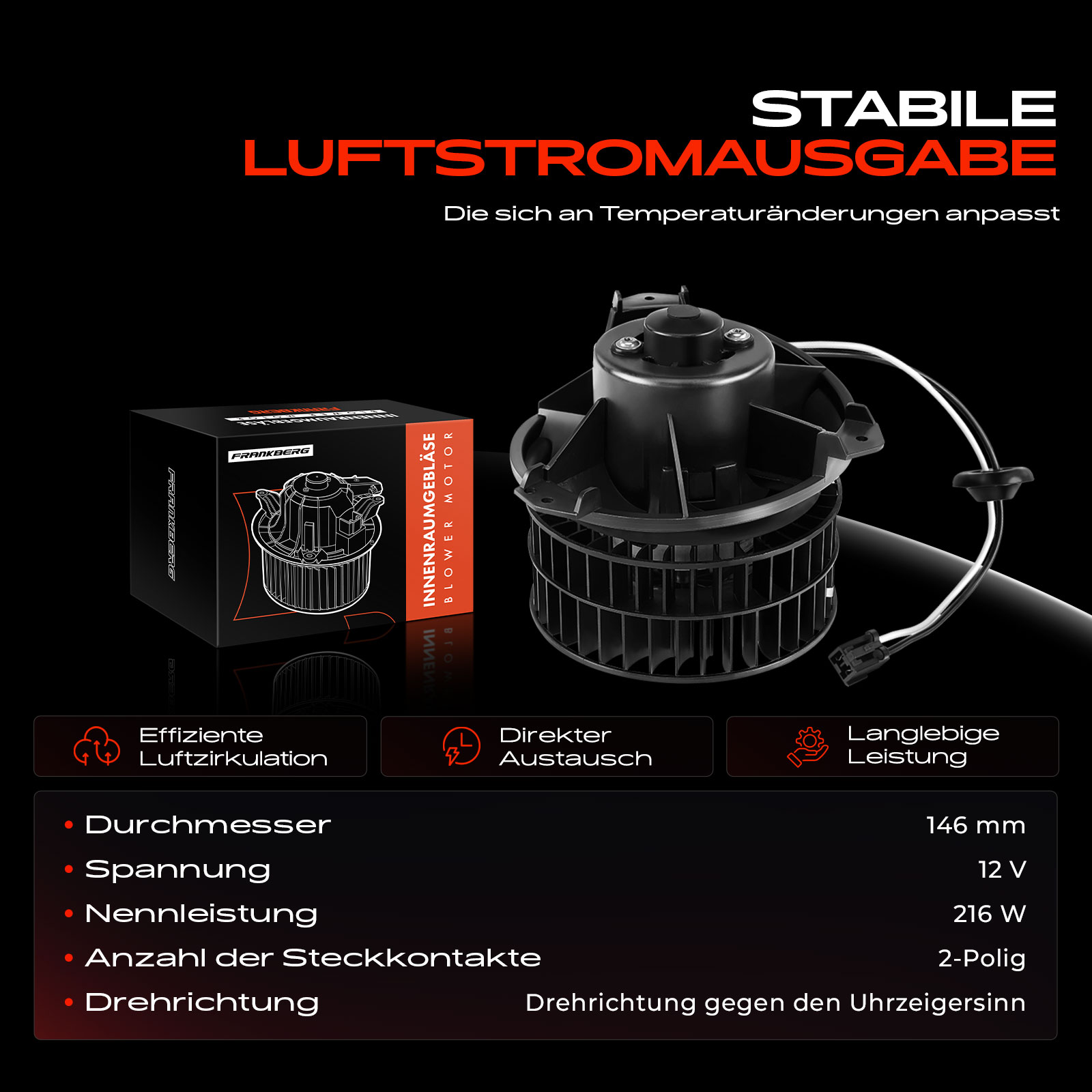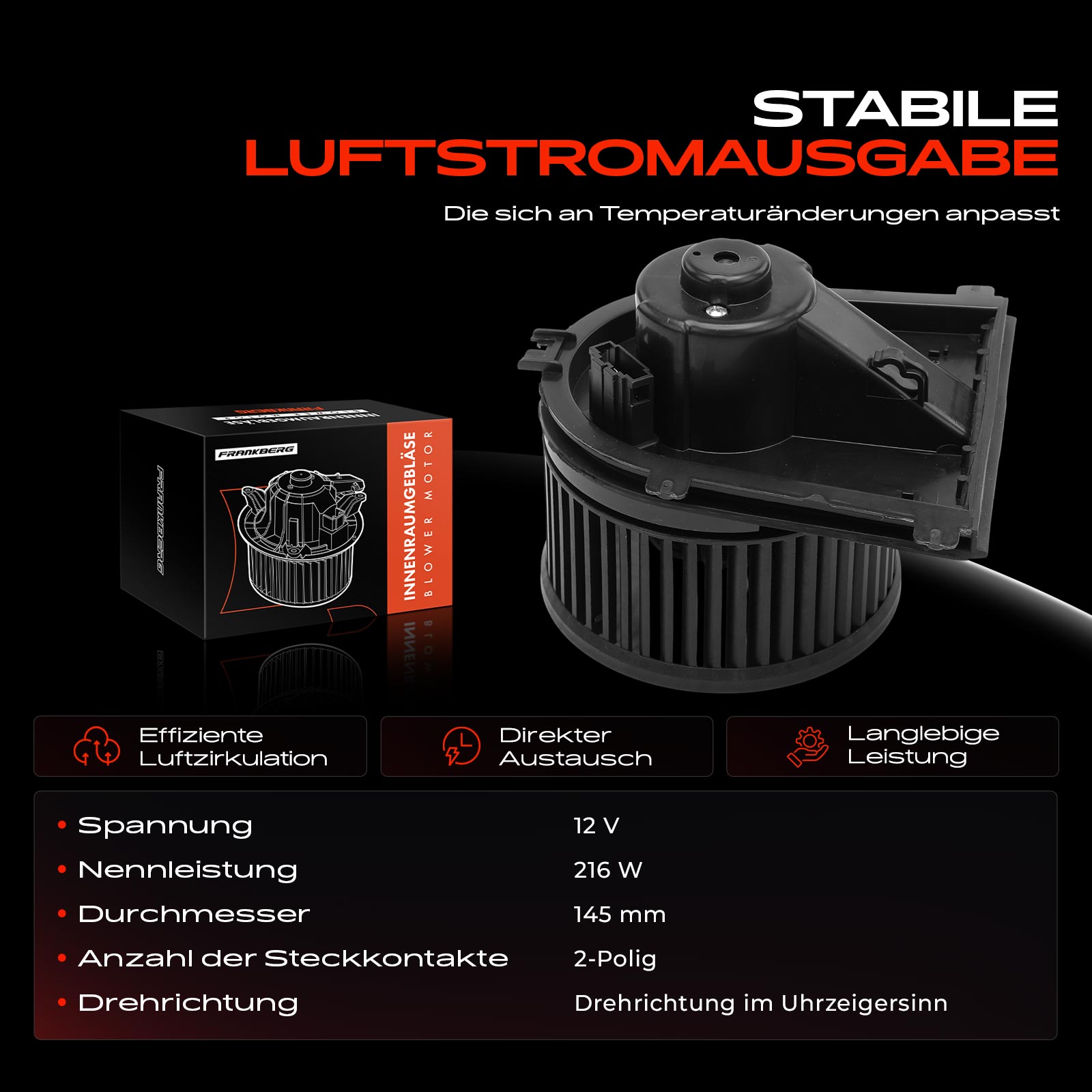 брой на щепселните контакти: 2-щифтенгаранция: 5 години гаранция или до 75 000kmØ: 148mmнапрежение: 12волтляв/десен волан: за автомобили с ляв воланмощност: 262Wобурудване на автомобила: за автомобили без климатизацияобурудване на автомобила: за автомобили с климатизаторпосока на въртене: въртене по посока срещу часовниковата стрелка