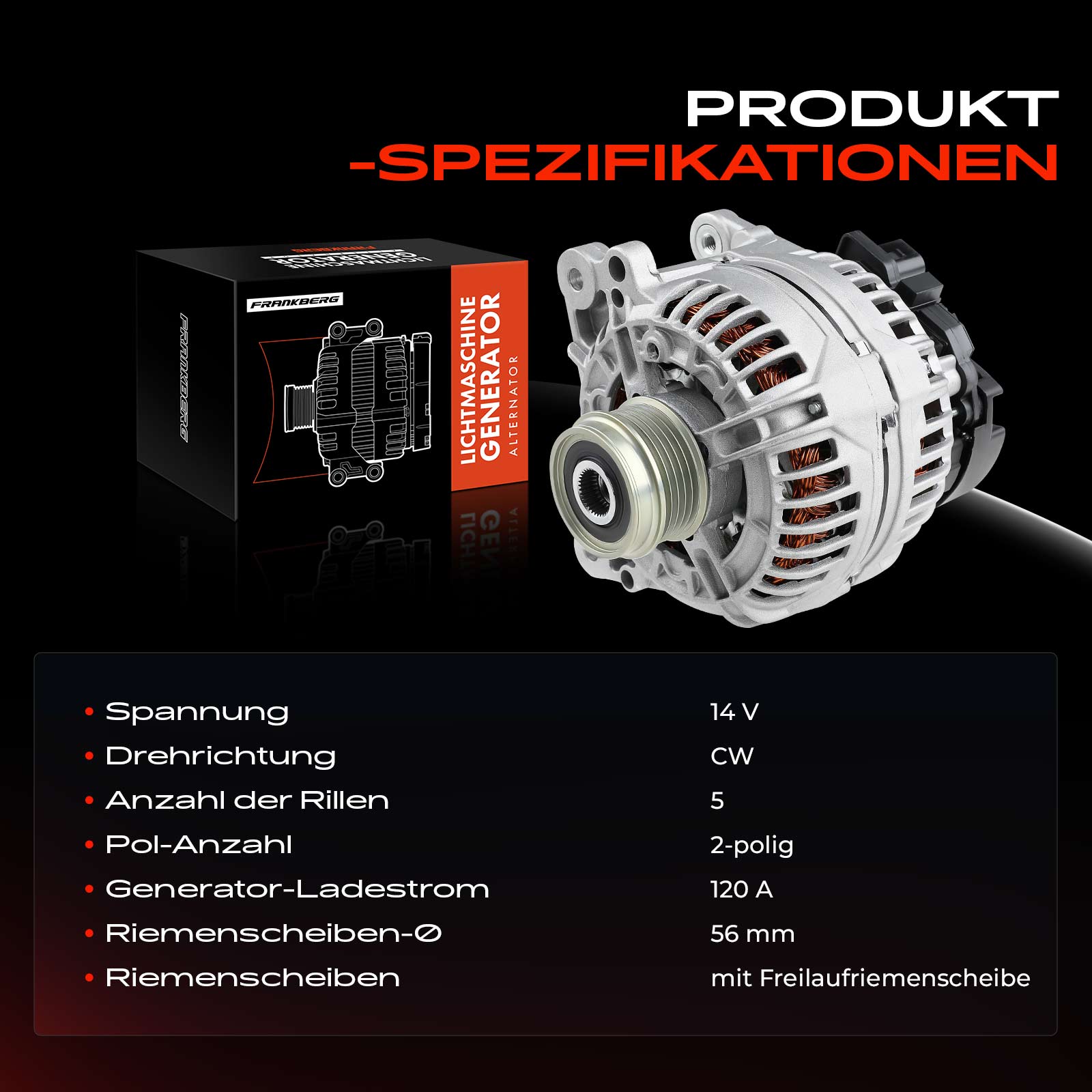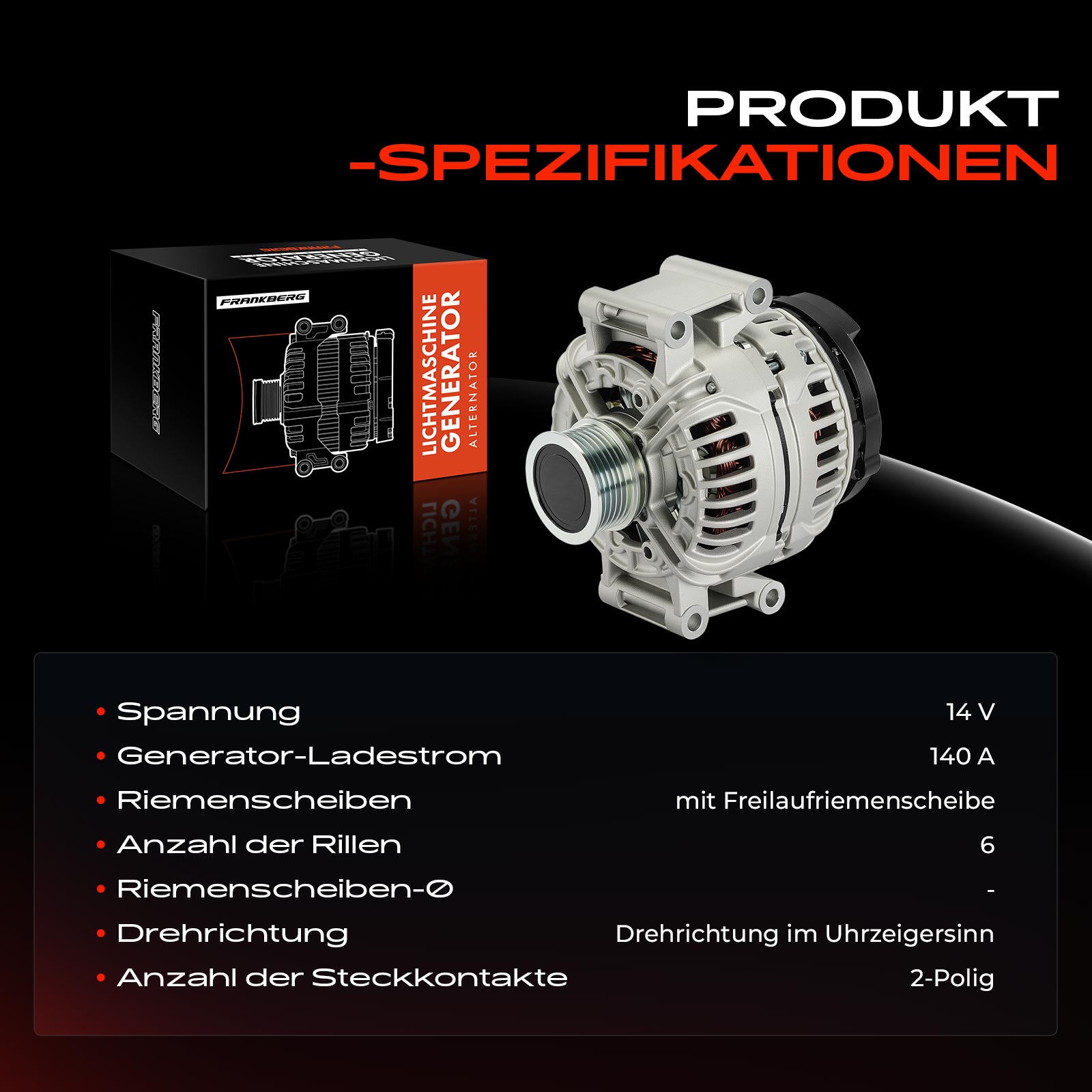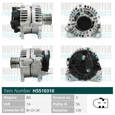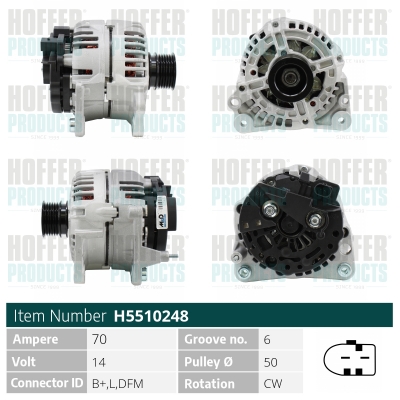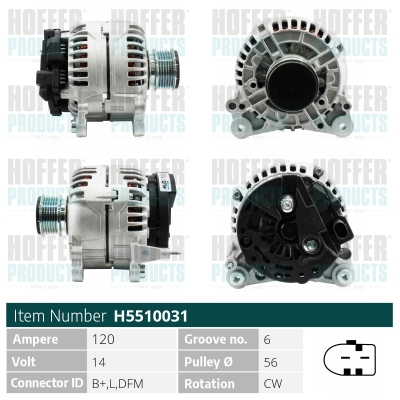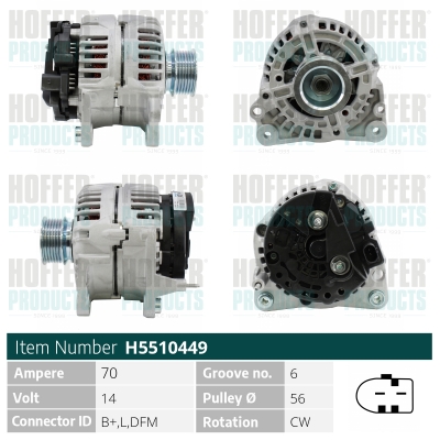 брой на ребрата: 6напрежение: 14волтзаряден ток на генератор: 140Аклема: M8 B+ [L-DFM]ремъчни шайби: с ремъчна шайба със свободен ходРемъчна шайба Ø: 56mm