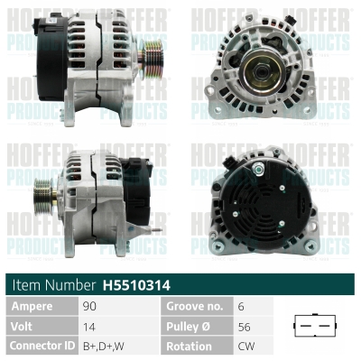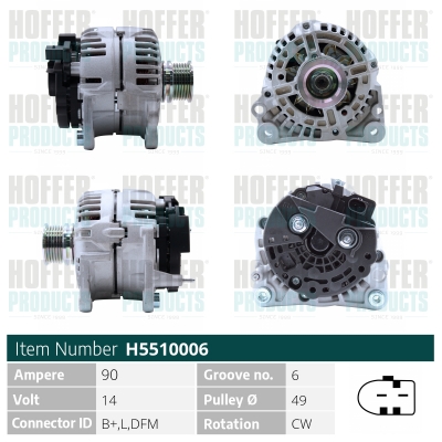 брой на ребрата: 6напрежение: 12волтзаряден ток на генератор: 90Аклема: M8 B+ [L-DFM]ремъчни шайби: с ремъчна шайба със свободен ходРемъчна шайба Ø: 56mm