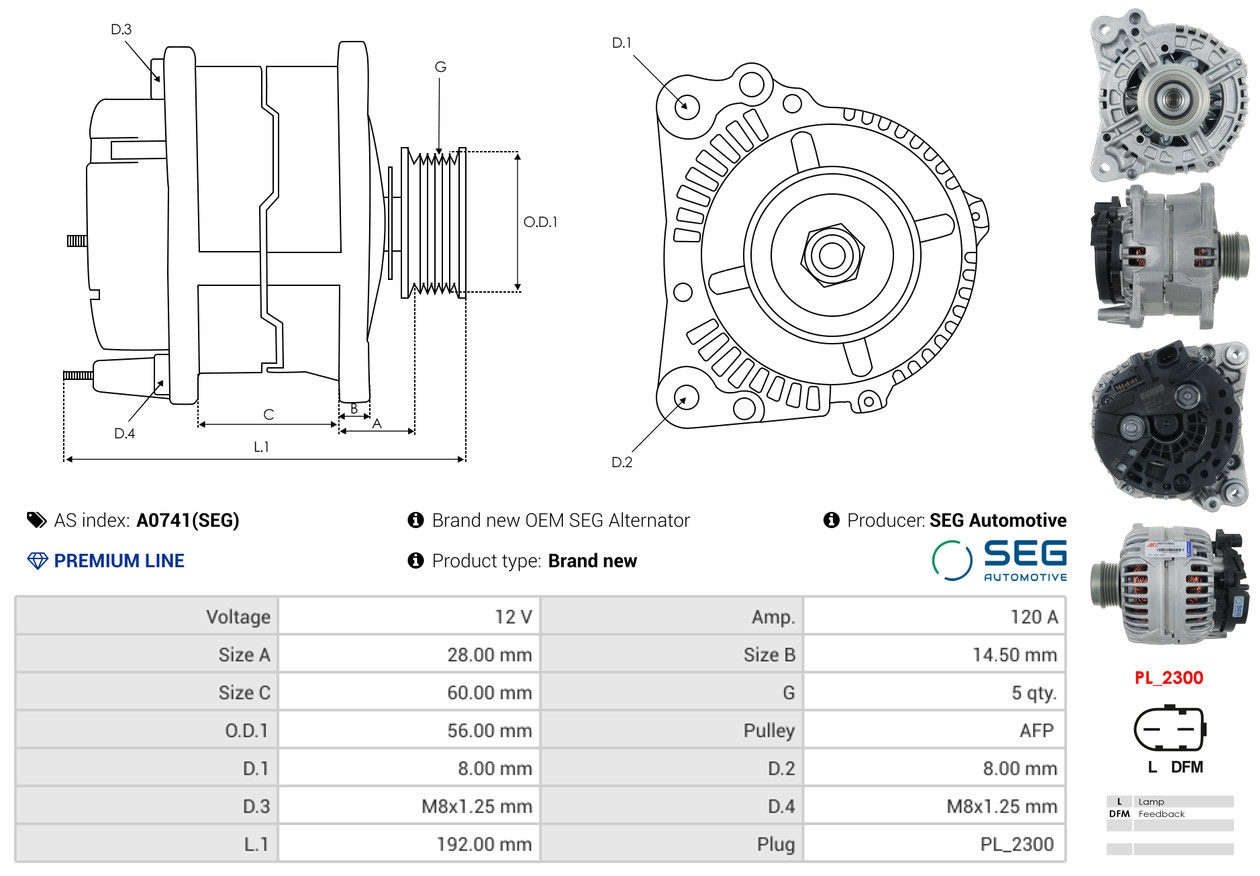 ID-изпълнение на щекера: PL61брой на каналите: 6Ø: 56mmнапрежение: 12волтзаряден ток на генератор: 90Аремъчни шайби: с многоремъчна шайба