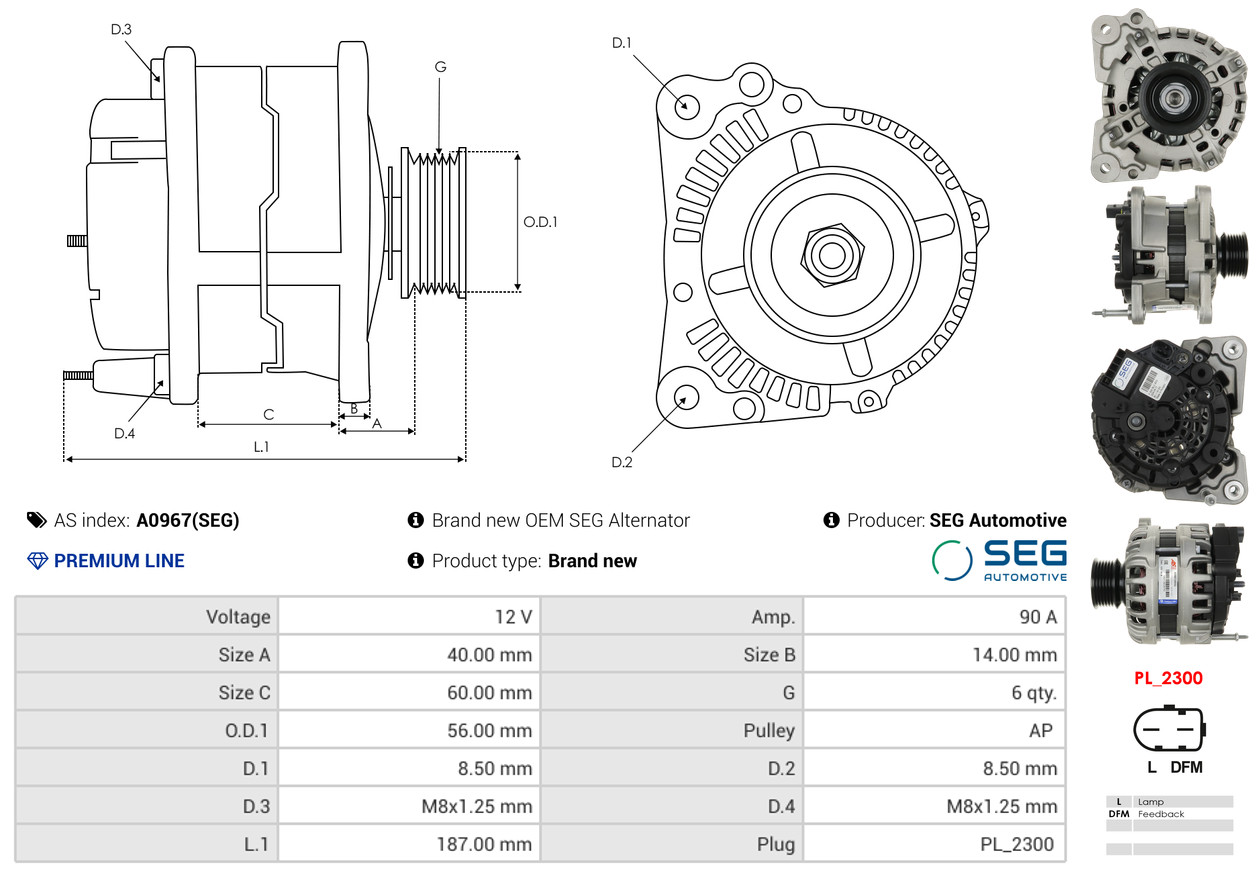 ID-изпълнение на щекера: PL61брой на каналите: 6версия: 301378RIRØ: 56mmнапрежение: 12волтзаряден ток на генератор: 90Аремъчни шайби: с многоремъчна шайба