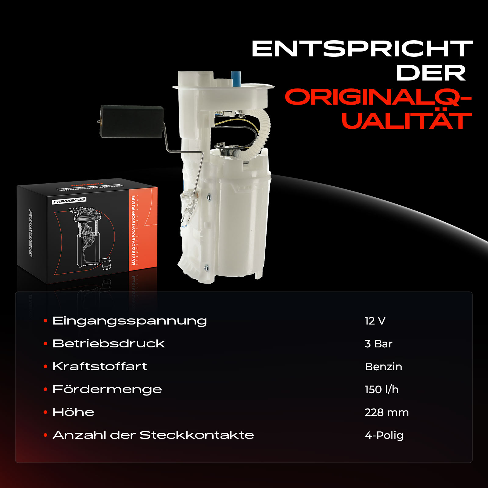 брой на щепселните контакти: 4-щифтенвид на горивото: бензинвид на експлоатация: електрическивисочина: 228mmдебит: 150литра/часдоп. артикул/доп. инфо. 2: без филтърдопълващ артикул /допълваща информация: без уплътнениенапрежение: 12волтработно налягане: 3барширина: 108mm