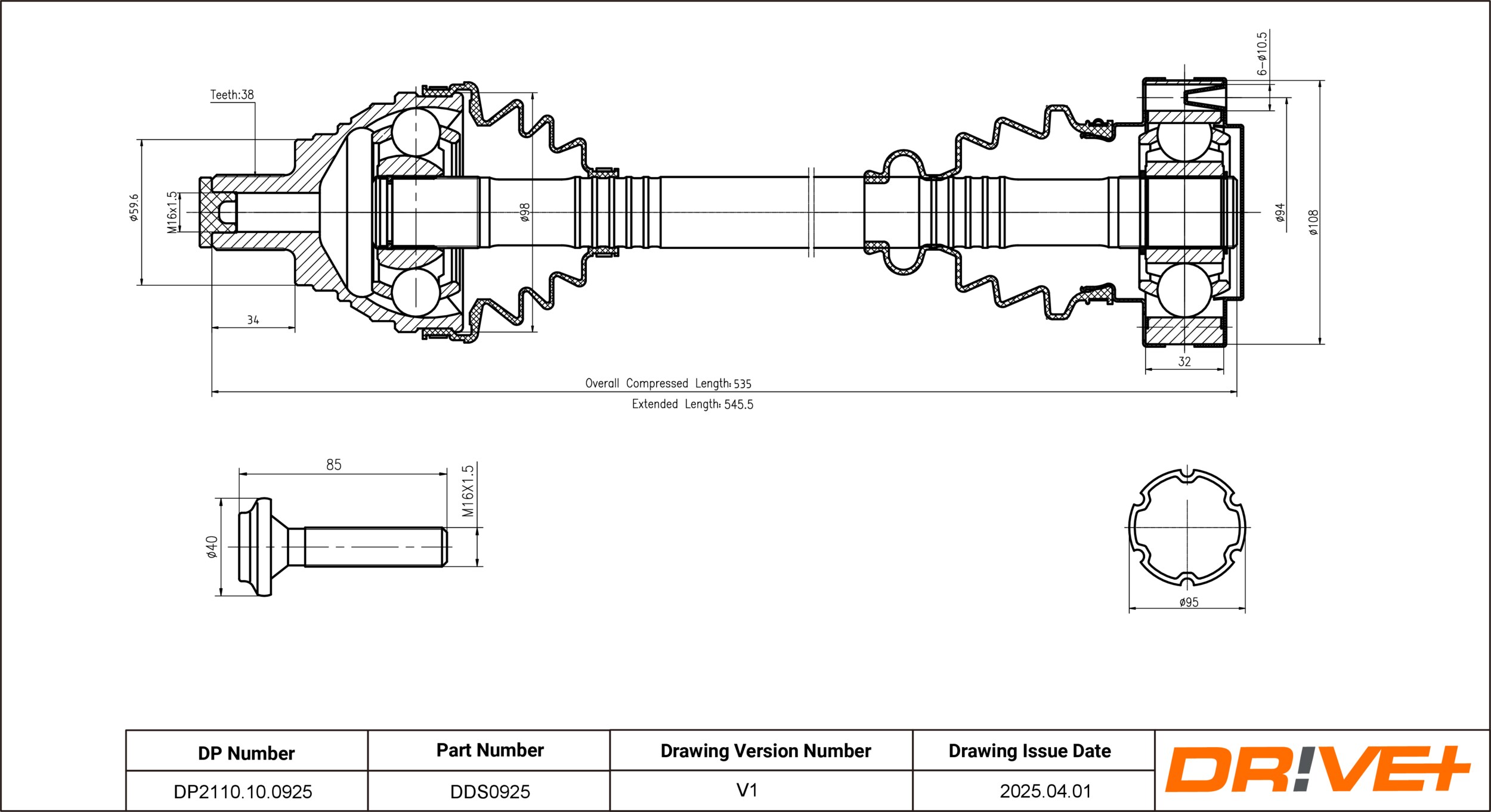 брой на дупките: 6външни зъби от страна на колелото: 38Отвор Ø: 10,5mmдиам. на гарн.: 60mmдиаметър на шарнира от страна на скоростната кутия: 108mmдължина: 538mmза OE-номер: JZW407449FXДиаметър на кръговата стъпка Ø: 94mmмярка на резбата: M16x1,5страна на монтаж: предна ос