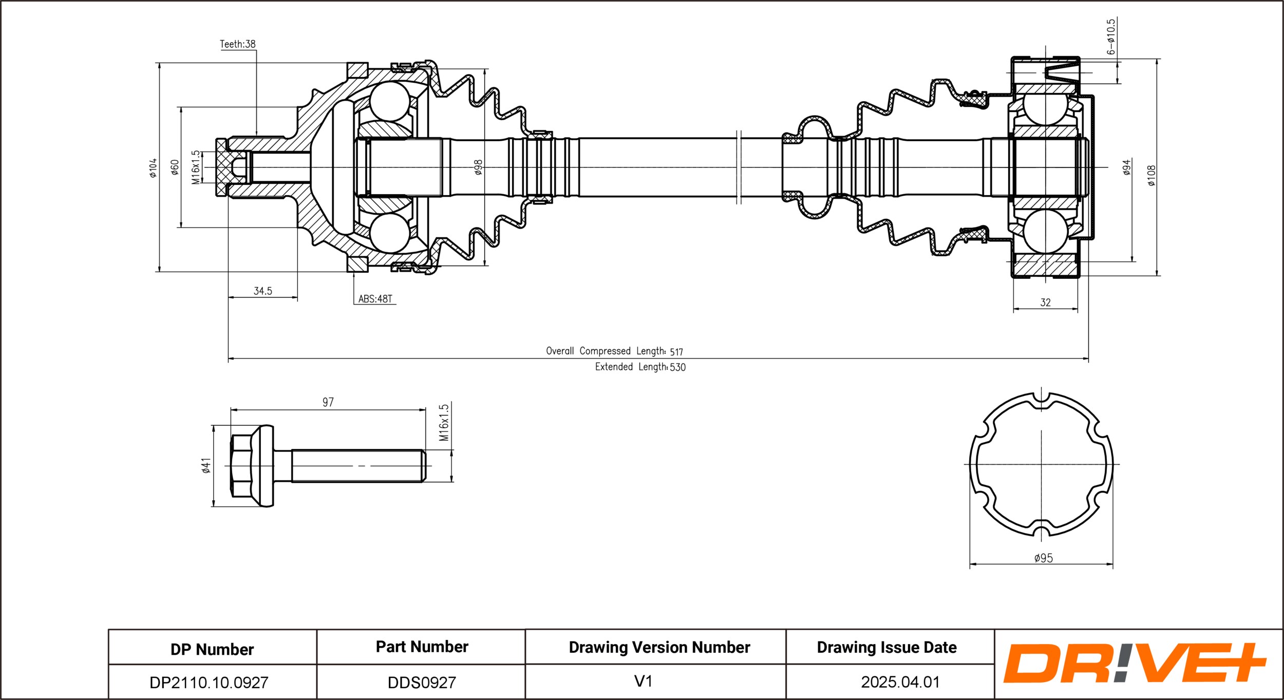 брой на дупките: 6брой на зъбите на ABS-пръстен: 48вид на шарнира: сферично каре (за предаване на постоянно движение)външни зъби от страна на колелото: 38диам. на гарн.: 60mmдиаметър на шарнира от страна на колелото: 98mmдиаметър на шарнира от страна на скоростната кутия: 108mmдължина: 517mmдължина 1: 517mmДиаметър на кръговата стъпка Ø: 94mmстрана на монтаж: на предната ос отляво