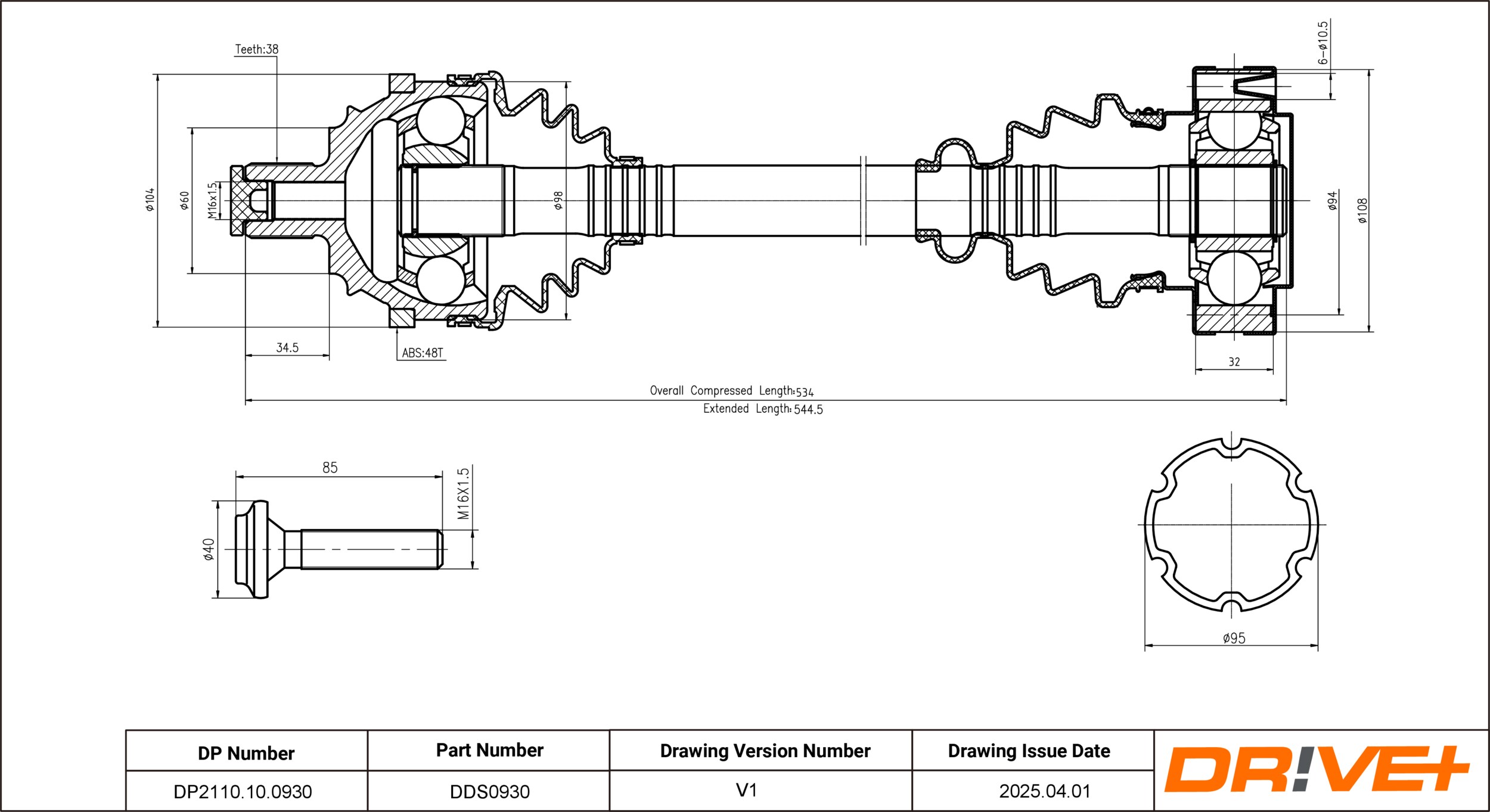 брой на дупките: 6брой на зъбите на ABS-пръстен: 48вид на шарнира: сферично каре (за предаване на постоянно движение)външни зъби от страна на колелото: 38диам. на гарн.: 60mmдиаметър на шарнира от страна на колелото: 98mmдиаметър на шарнира от страна на скоростната кутия: 108mmдължина: 534mmдължина 1: 534mmДиаметър на кръговата стъпка Ø: 94mmстрана на монтаж: на предната ос отляво