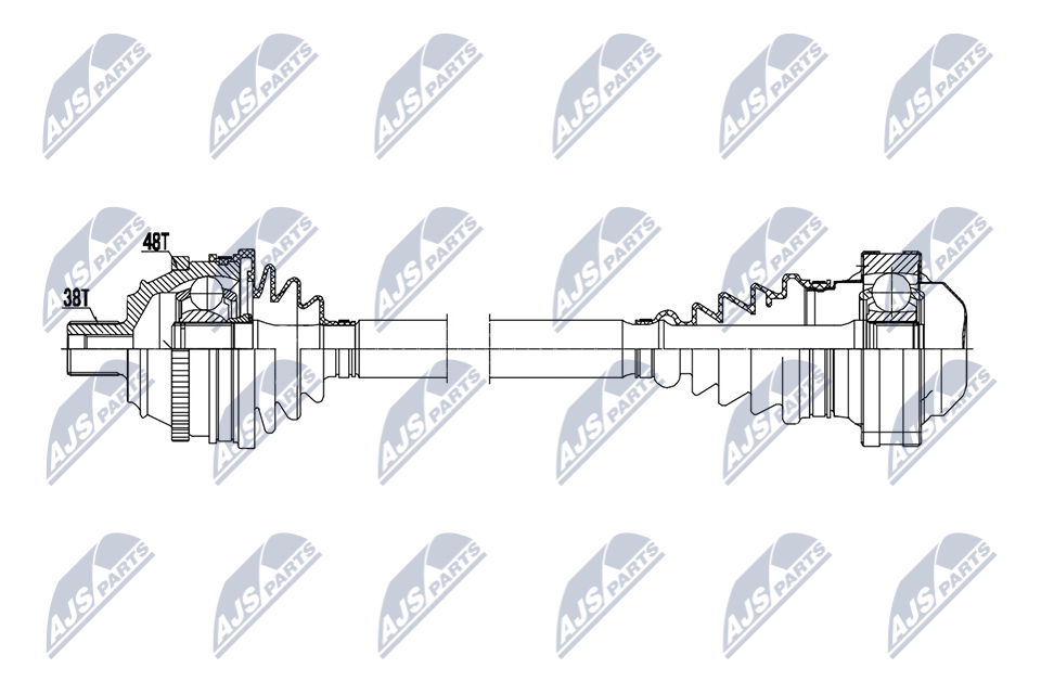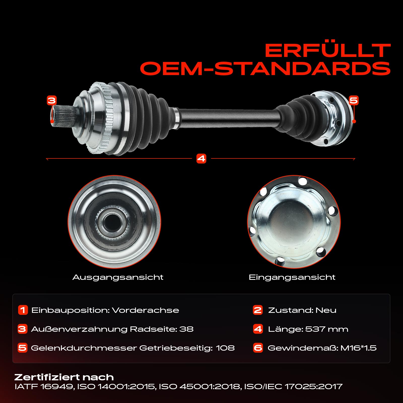 страна на монтаж: на предната ос отдяснострана на монтаж: на предната ос отлявоброй на зъбите на ABS-пръстен: 48външни зъби от страна на колелото: 38диаметър на шарнира от страна на скоростната кутия: 108mmдължина: 538mm