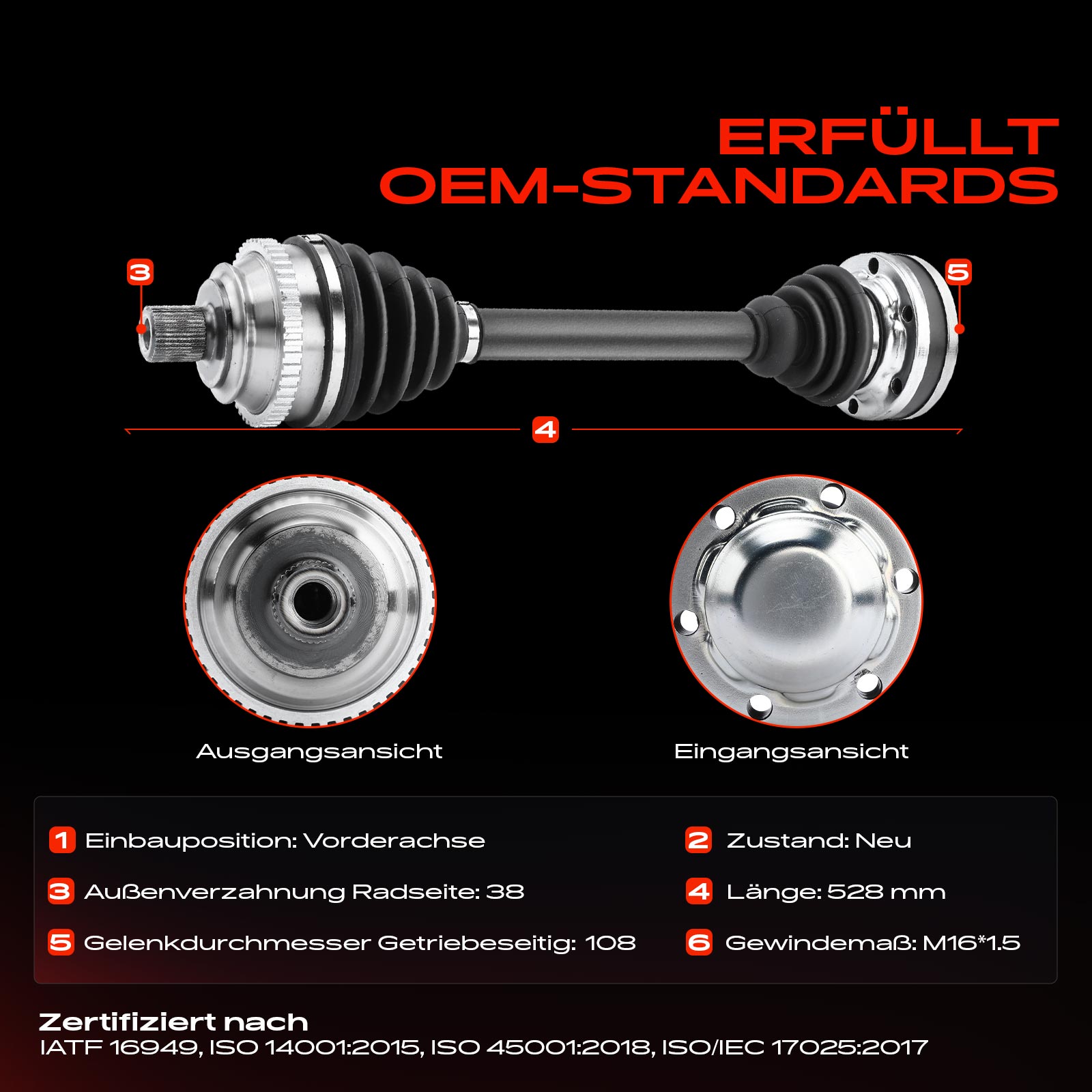 страна на монтаж: на предната ос отдяснострана на монтаж: на предната ос отлявоброй на зъбите на ABS-пръстен: 48външни зъби от страна на колелото: 38диаметър на шарнира от страна на скоростната кутия: 108mmдължина: 528mm