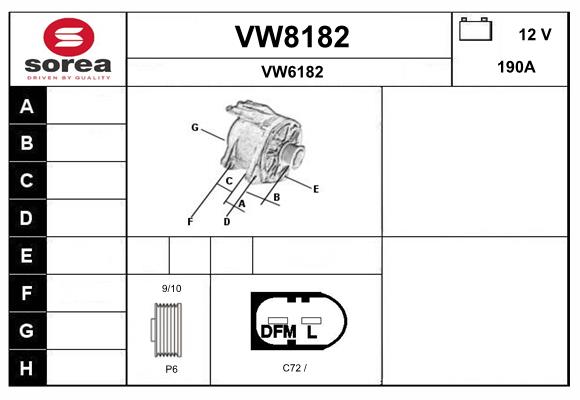 брой на дупките за закрепване: 4брой на каналите: 6напрежение: 12волтзаряден ток на генератор: 190Акачество: +Lineклема: B+ (M8)ремъчни шайби: с ремъчна шайба със свободен ходРемъчна шайба Ø: 56mm