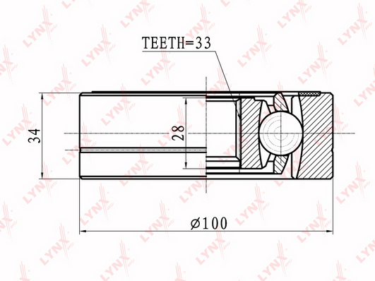 вид на шарнира: сферично каре (за предаване на постоянно движение)външен диаметър: 100mmВътрешни зъби страна на диференциала (извод предавка): 33дължина: 34mmстрана на монтаж: от страната на трансмисията