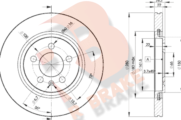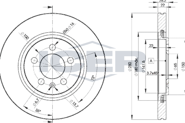 TECDOC-номер на двигател: 22617брой дупки на джанта: 5година на производство до: 199604брой на дупките: 5вид на спирачния диск: вентилиранвисочина: 28mmвъншен диаметър: 280mmдебелина на спирачния диск: 22mmОтвор Ø: 16mmДиаметър на кръговата стъпка Ø: 100mmмин. дебелина: 20mmстрана на монтаж: предна осцентриращ диаметър: 65mm