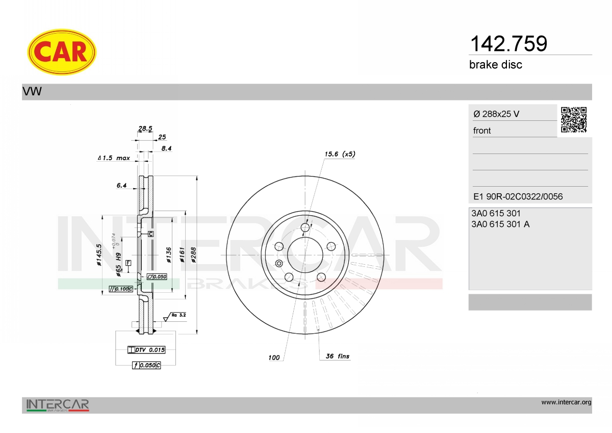брой дупки на джанта: 5година на производство от: 199605брой на дупките: 5вид на спирачния диск: вентилиранвисочина: 28,2mmвъншен диаметър: 288mmсила на затягане (въртящ момент): 120Нютонметърдебелина на спирачния диск: 25mmза OE-номер: 3A0615301Aмин. дебелина: 23mmповърхност: боядисанстрана на монтаж: предна ос