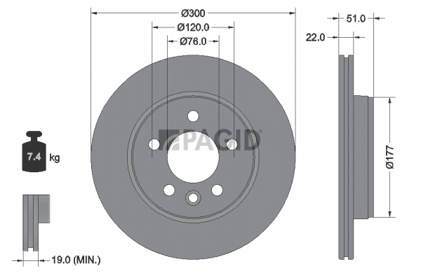страна на монтаж: задна осброй на дупките за закрепване: 5вид на спирачния диск: вентилиранвисочина: 51mmвъншен диаметър: 300mmдебелина на спирачния диск: 22mmДиаметър на кръговата стъпка Ø: 120mmмин. дебелина: 19mmтегло: 7,8kgцентриращ диаметър: 76mm