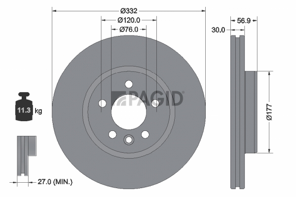 за PR-номер: 2E4спирачна уредба: 13страна на монтаж: предна осджанта: 5-дупкивид на спирачния диск: вентилиранвисочина: 57,1mmвъншен диаметър: 332mmдебелина на спирачния диск: 30mmГлавина Ø: 177mmДиаметър на кръговата стъпка Ø: 120mmмин. дебелина: 27mmповърхност: с покритиетегло: 11,11kgцентриращ диаметър: 76mm