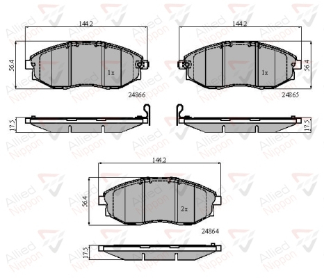 страна на монтаж: предна освисочина: 56,5mmдебелина: 17mmконтактен датчик за износване: не е за подготвен за предупредителен датчик за износванеспирачна система: Akebonoширина: 144mm