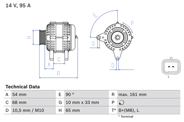 ID-изпълнение на щекера: L-D Plug 84брой на ребрата: 3напрежение: 14волтзаряден ток на генератор: 95Аизпълнение на електрическата мрежа: за автомобили с 12V електросистемаклема: M8 B+ремъчни шайби: с многоремъчна шайбаРемъчна шайба Ø: 65mm
