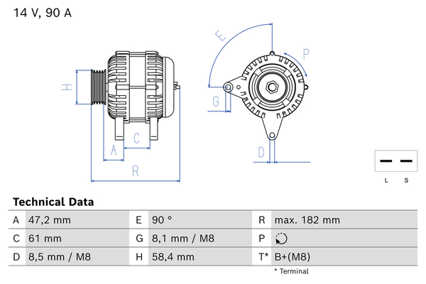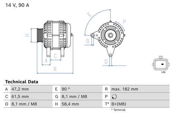 брой на дупките за закрепване: 4брой на каналите: 3напрежение: 12волтзаряден ток на генератор: 90Акачество: Bosch Newклема: B+ (M8)ремъчни шайби: с ремъчна шайба със свободен ходРемъчна шайба Ø: 58mmстойка за закрепване: 90°