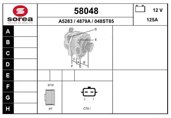 брой на дупките за закрепване: 4брой на каналите: 7напрежение: 12волтзаряден ток на генератор: 125Акачество: +Line Originalклема: B+ (M8)Ремъчна шайба Ø: 48,9mmстойка за закрепване: +90°
