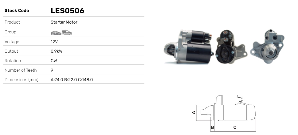 TECDOC-номер на двигател: 18563брой на зъбите: 9напрежение: 12волтстартова мощност: 1киловатпосока на въртене: въртене по посока на часовниковата стрелка