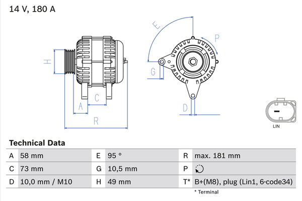 брой на каналите: 6напрежение: 14волтзаряден ток на генератор: 180Аклема: B+(M8)посока на въртене: въртене по посока на часовниковата стрелкаремъчни шайби: многоремъчна шайбаРемъчна шайба Ø: 49mm