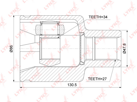 страна на монтаж: от страната на трансмисиятастрана на монтаж: предна освъншни зъби откъм диференциал: 27Вътрешни зъби страна на диференциала (извод предавка): 34диам. на гарн.: 47,7mmдължина: 130,5mm