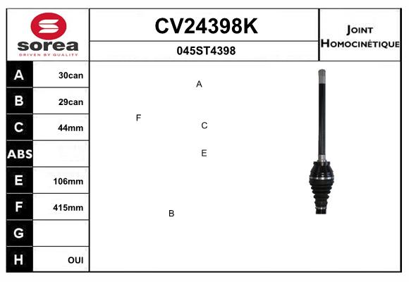 страна на монтаж: на предната ос отдяснострана на монтаж: от страната на трансмисиятавъншни зъби откъм диференциал: 30вътрешни зъби от страната на диференциала свързване с трансм: 29Ø: 106mmдиам. на гарн.: 44mmдължина: 507mm