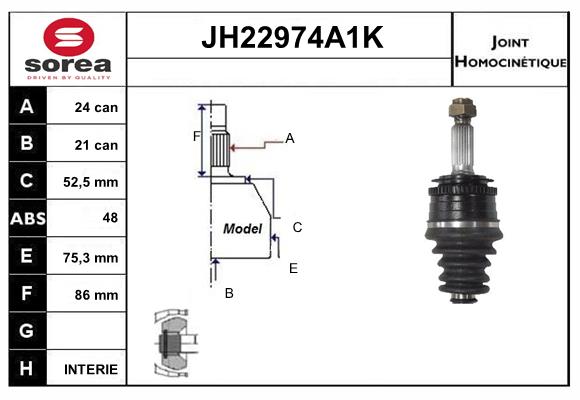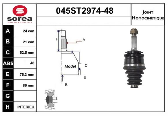 спирачна/динамика на движение: 1страна на монтаж: на предната ос отлявострана на монтаж: от страната на колелототип на трансмисията: 6брой на зъбите на ABS-пръстен: 48вид на шарнира: сферично каре (за предаване на постоянно движение)външен диаметър: 72,8mmвъншни зъби от страна на колелото: 25вътрешни зъби от страната на колелото: 21диам. на гарн.: 52,5mmмярка на резбата: 22x1,5преработен механично: с вмъкване отвътре(в средата)