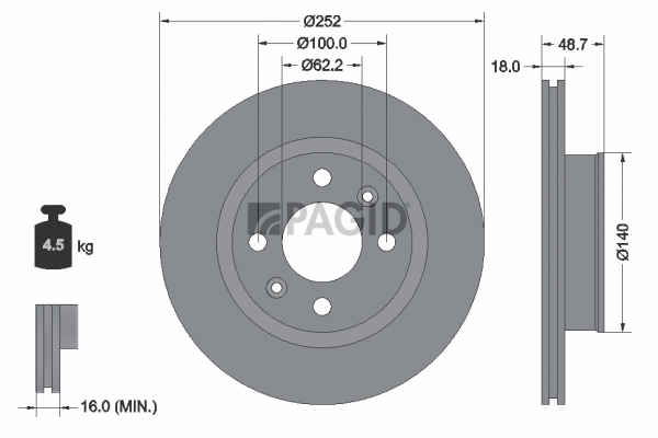 размер на джанта [цол=инч]: 14,0страна на монтаж: предна осджанта: 4-дупкивид на спирачния диск: вентилиранвисочина: 48,7mmвъншен диаметър: 252mmдебелина на спирачния диск: 18mmГлавина Ø: 140mmДиаметър на кръговата стъпка Ø: 100mmмин. дебелина: 16mmповърхност: с покритиетегло: 4,5kgцентриращ диаметър: 62mm