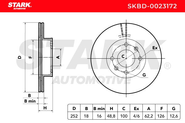 размер на джанта [цол=инч]: 14брой на дупките: 4вид на спирачния диск: вентилиранвисочина: 48,7mmвъншен диаметър: 252mmвътрешен диаметър: 126mmдебелина на спирачния диск: 18mmДиаметър на кръговата стъпка Ø: 100mmмин. дебелина: 16mmмярка на резбата: 12,6страна на монтаж: предна остегло: 4,5kgцентриращ диаметър: 62,2mm