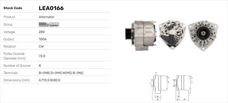 дебелина 1: 80,0mmнапрежение: 28волтзаряден ток на генератор: 100Аклема: B+(M8) D+(M4) W B-посока на въртене: въртене по посока на часовниковата стрелка