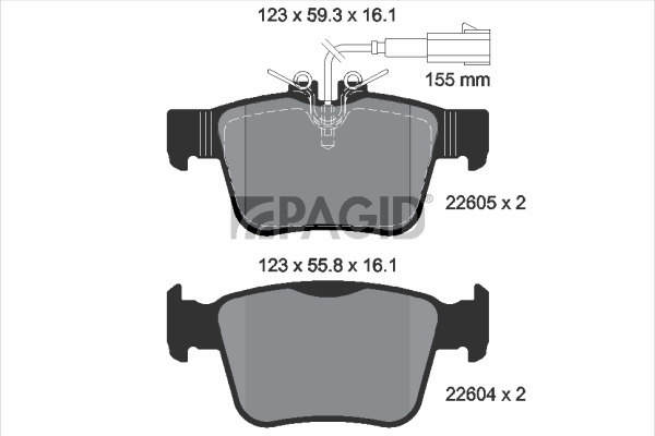 страна на монтаж: задна осWVA-номер: 22605дебелина: 16mmдължина: 123mmконтактен датчик за износване: със сензор за износванеспирачна система: ATEширина: 59,3mm