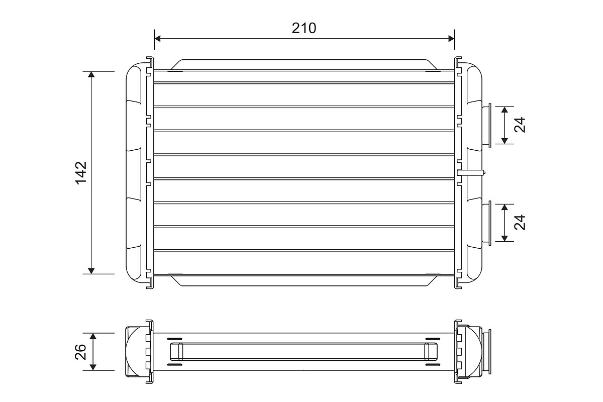 Входящ отвор Ø: 24mmИзходящ отвор Ø: 24mmдълбочина на мрежа: 26mmдължина на мрежа: 208mmизпълнение на охладител: запоени охлацдащи ламелиматериал на ламелите на радиатора: алуминийматериал на резервоар (охладител): алуминийширина на мрежа: 148mm