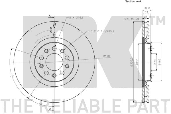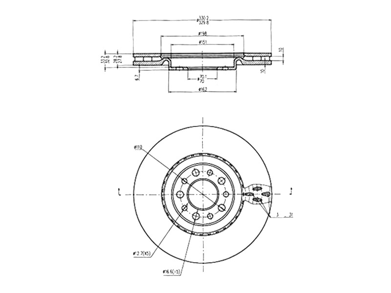 брой на дупките: 5вид на спирачния диск: вентилиранвисочина: 39,7mmвъншен диаметър: 330mmвътрешен диаметър: 151mmдебелина на спирачния диск: 28mmДиаметър на кръговата стъпка Ø: 110mmмин. дебелина: 26mmмярка на резбата: 16,7страна на монтаж: предна остегло: 9,9kgцентриращ диаметър: 70mm