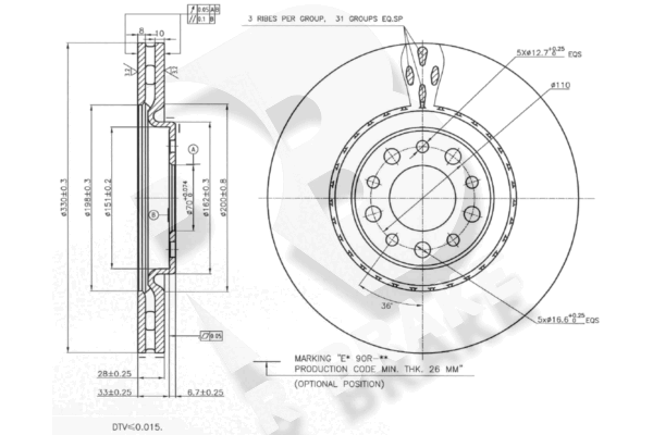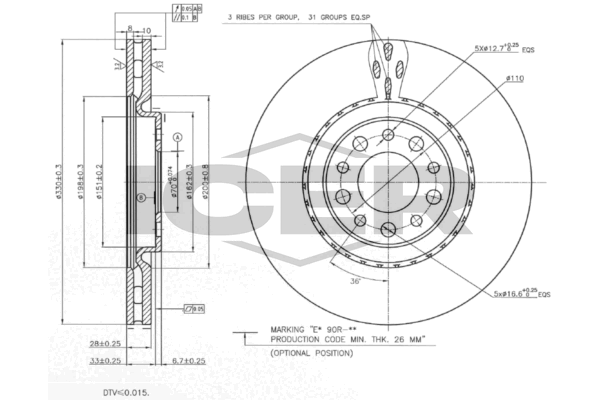 година на производство до: 201110обурудване на автомобила: за автомобили със спортен пакетстрана на монтаж: предна осброй на дупките: 5вид на спирачния диск: вентилиранвисочина: 39,7mmвъншен диаметър: 330,0mmвътрешен диаметър: 151,0mmдебелина на спирачния диск: 28,0mmОтвор Ø: 16,6mmдоп. артикул/доп. инфо. 2: с винтовеконтролен знак за преглед: E1 90R-02C0115/0583Диаметър на кръговата стъпка Ø: 110,0mmмин. дебелина: 26,0mmповърхност: с покритиецентриращ диаметър: 70,0mm